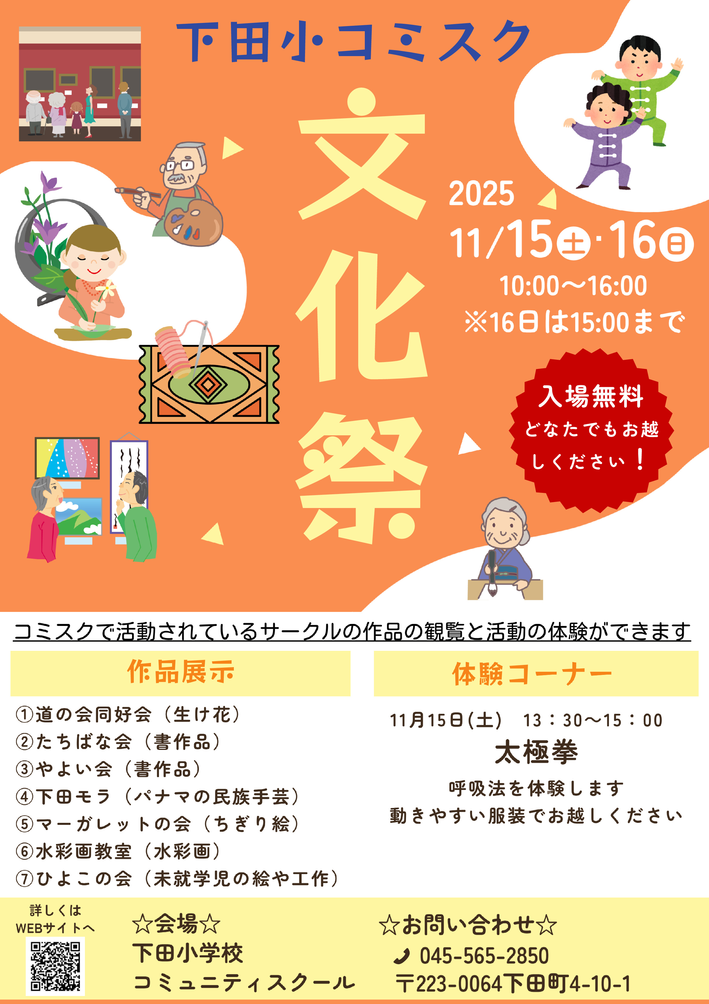 11月15日(土)〜16日(日)10:00〜16:00(日曜日は15:00まで)「2025下田小コミスク文化祭」を開催します。ご利用団体の皆様の力作を展示していますので、ぜひご来館ください!また、同時開催で「下田をつなぐスタンプラリー」も開催中、コミスク・下田ケアプラ・下田町自治会館をめぐって、景品をゲットしましょう!